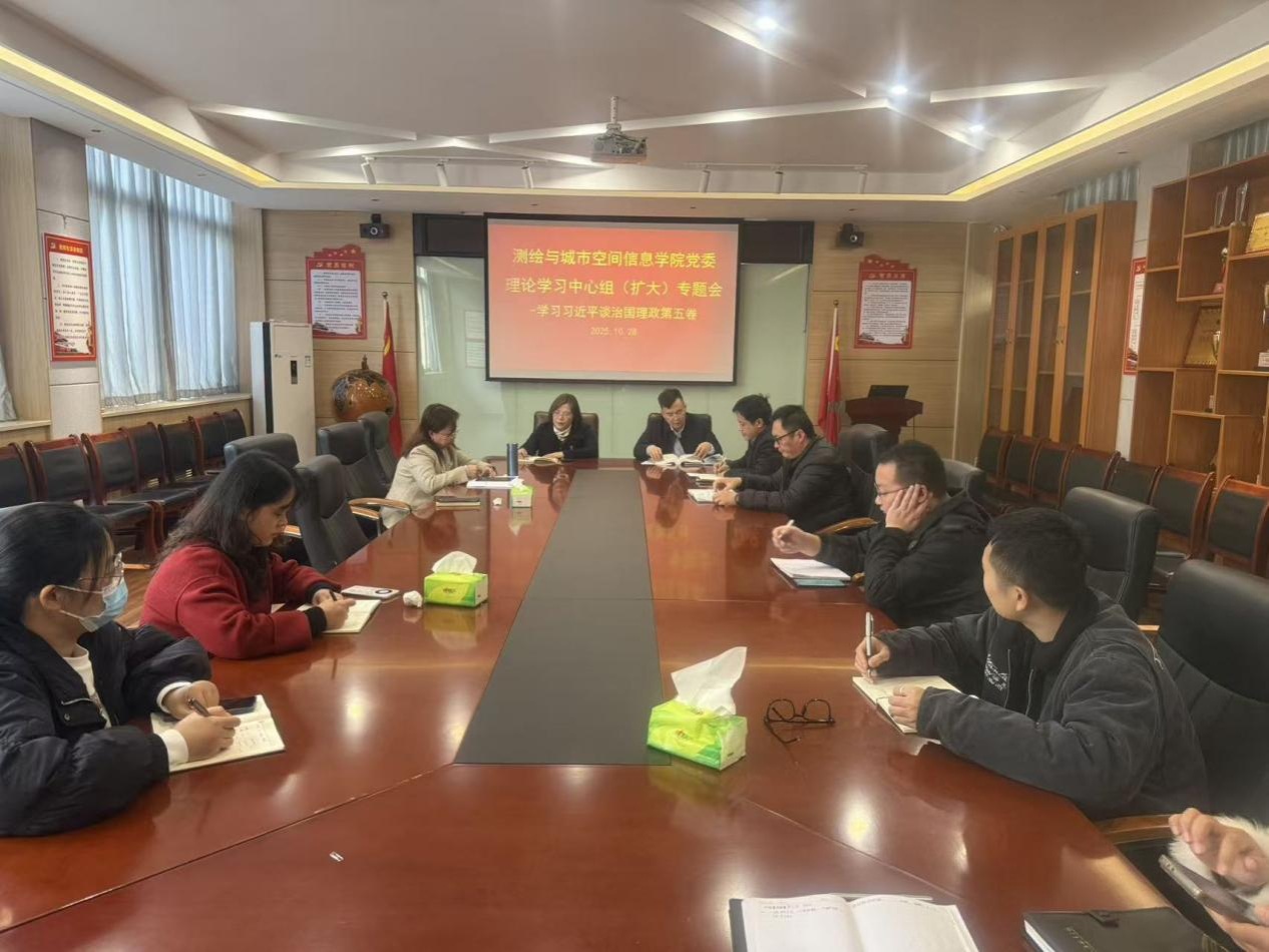 10月28日号下午,测绘与城市空间信息学院党委理论学习中心组(扩大)在学院B209会议室召开集体学习会议,专题学习研讨《习近平谈治国理政》第五卷。学院党委理论学习中心组全体成员、各党支部书记参会,会议由学院党委书记武伯军主持。